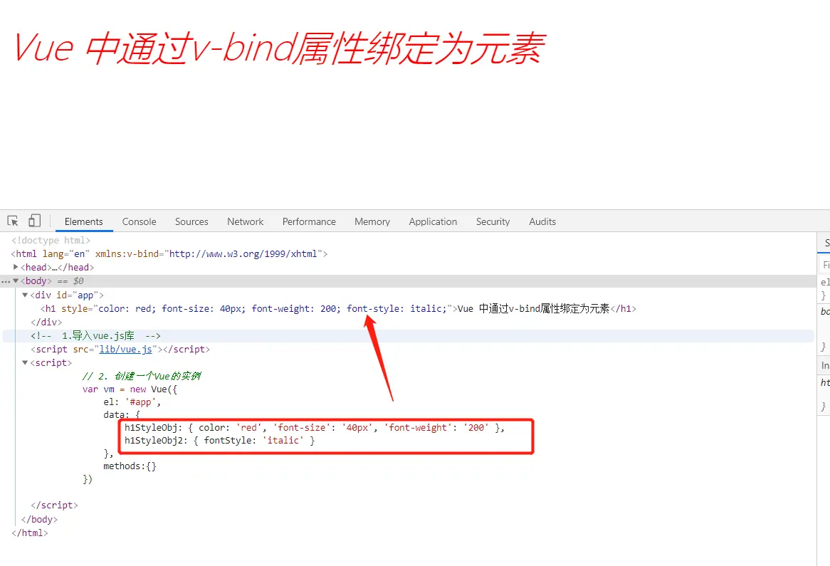 <h1 :style="[h1StyleObj, h1StyleObj2]">Vue 中通过v-bind属性绑定为元素</h1>