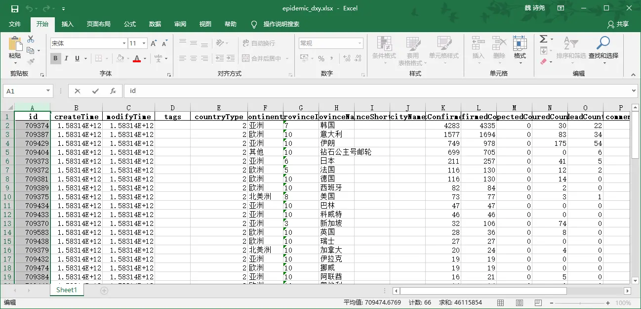 说明: epidemic_dxy_df 是一个 DataFrame ,这里直接通过 DataFrame 的 to_excel 进行 Excel 导出。