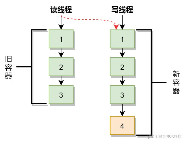 - 当添加元素是,先将当前容器就行复制(Copy),然后在新的容器中条件元素,添加完成后**,再将原容器的引用指向新容器**。