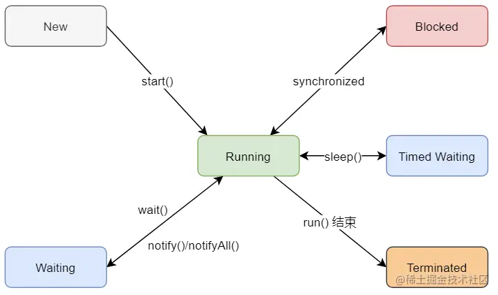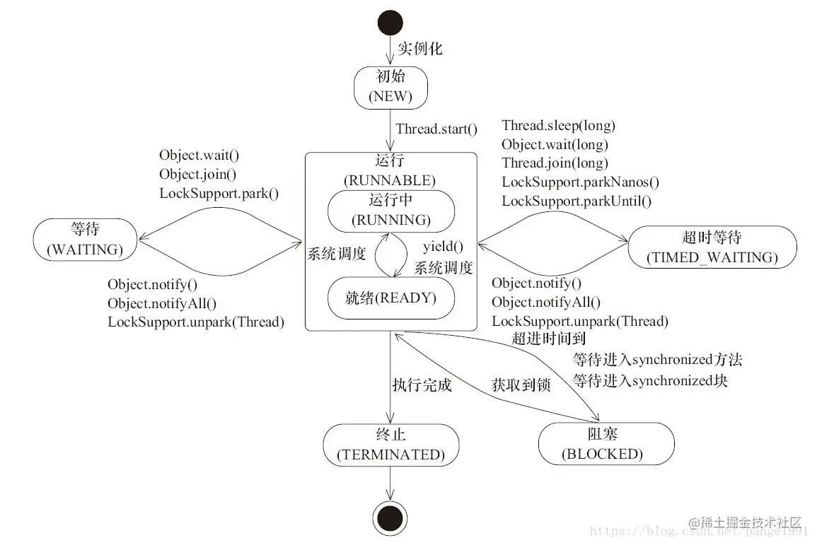 - Java线程实现是基于一对一的线程模型:即我们在使用Java线程时,Java虚拟机内部转而调用当前操作系统的内核线程来完成当前任务