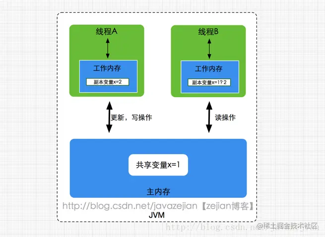 unlock)操作必然发生同一个锁加锁(lock)之前 volatile规则:volatile变量在每次线程被访问时,都强迫从主内存中读该变量的值,而当改变量发生变化时,又会强迫将最新的值刷新到主内存,任何时刻,不同的线程总是能够看到该变量的最新值- 线程启动规则:线程start方法先于它的每一个动作。在主线程A执行过程中,启动子线程B,那么线程A在启动子线程B之前对共享变量的修改结果对线程B可见