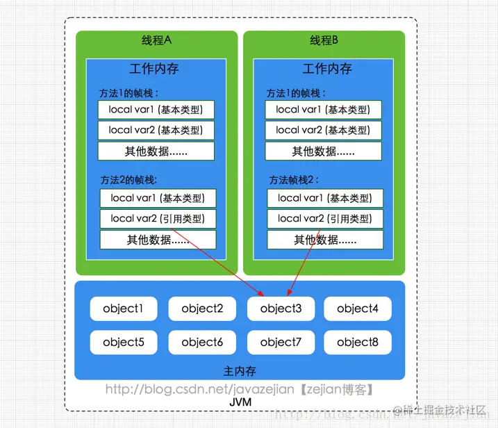 - 主内存:主要存储Java实例对象(成员变量、局部变量等),共享的类信息、常量、静态变量,存在多线程访问的安全问题。可与前面介绍的物理硬件的主内存类比,但此处仅是虚拟机内存的一部分