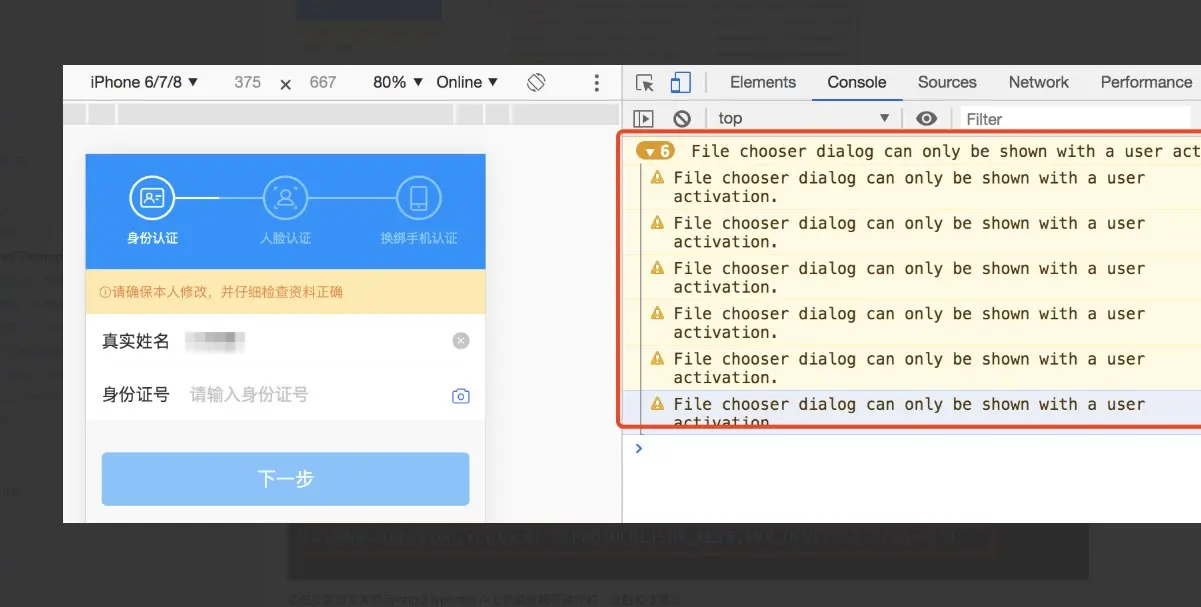 经过反复验证发现当<input type=file />上有跳转网页动作时,会触发该警告