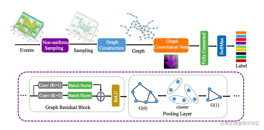 - 基于 NVS 数据的分类网络架构如下:首先采用非均匀采样策略获得一小组神经形态事件进行计算和记忆高效处理然后将采样事件构造成一个半径邻域图,并由我们提出的残差图CNNs进行处理,进行目标分类。 如下图: