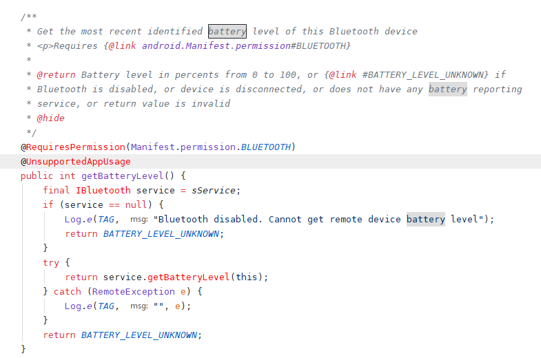 最近的项目中有一个获取连接蓝牙设备电量的小需求,我查找了一些资料,发现谷歌在Android8.0推出了一个getBatteryLevel的api,用来获取蓝牙设备电量百分比的方法。