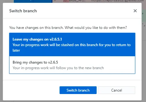 我们选择 Bring my changes to xxx 就可以将修改内容带到dev分支,再commit和push就可以啦。
