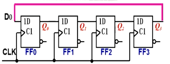 作用: 任意给定一个初始值,然后就将Q3扔到第一位,然后Q0Q1Q2右移一位,不断循环,达到计数的目的