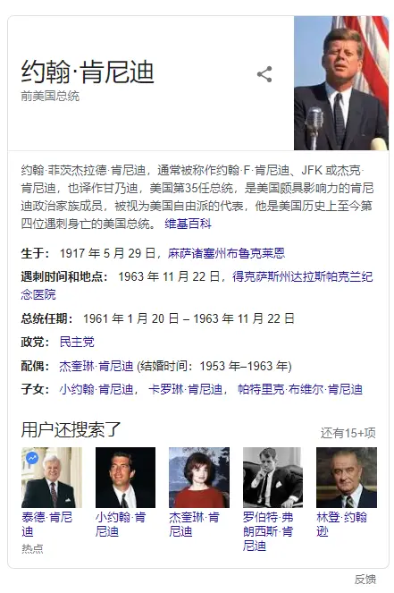 在你用谷歌搜索时,比如搜索“肯尼迪”,搜索结果的右侧就会出现一个展示有肯尼迪相关信息的小窗格。