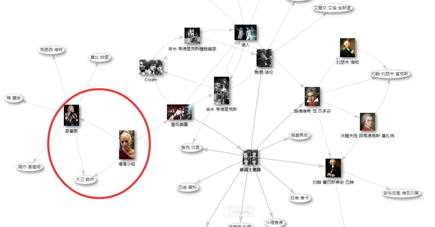 在上面的Lady Gaga的例子中,我们在图的结果中发现了,Lady Gaga和麦当娜的音乐都受到了大卫·鲍伊的影响——如果不是图谱中展示了直观的结果,人们通常不会把这三个人联系起来。
