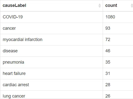 而如果把时间改成2020年以来,新冠是有名人士最主要的死亡原因,远远超过其他死因。