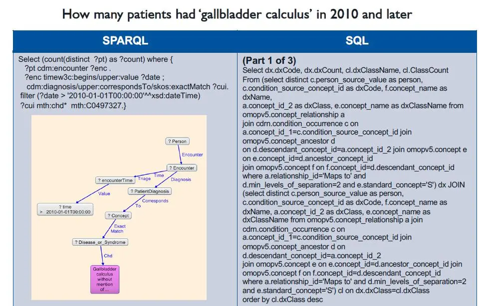在课程中,Dr. Jans Aasman举了一个查询的例子——查询有多少个病人患有胆结石。
