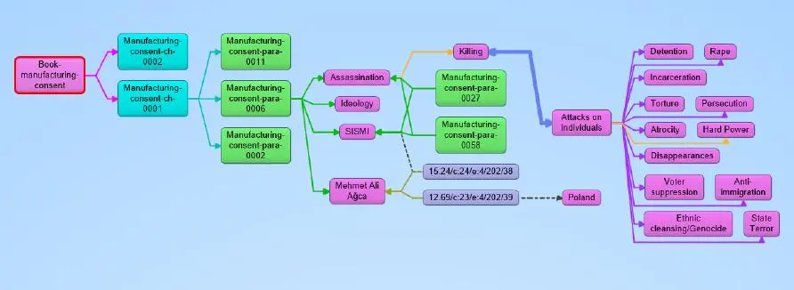 最终呈现出的效果是这样的: 他的每本书的章节段落都被按照层次纳入到了图谱中,段落中提及的关键概念也都被提取了出来。