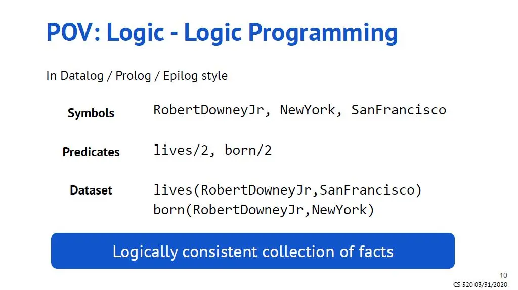 事实的集合,很好理解,三元组表达的就是一个又一个的事实。 比如,小罗伯特唐尼住在旧金山的事实,在图谱中表达为lives(RobertDowneyJr, SanFrancisco); 小波伯特唐尼出生在纽约,则表达为born(RobertDowneyJr, NewYork)。