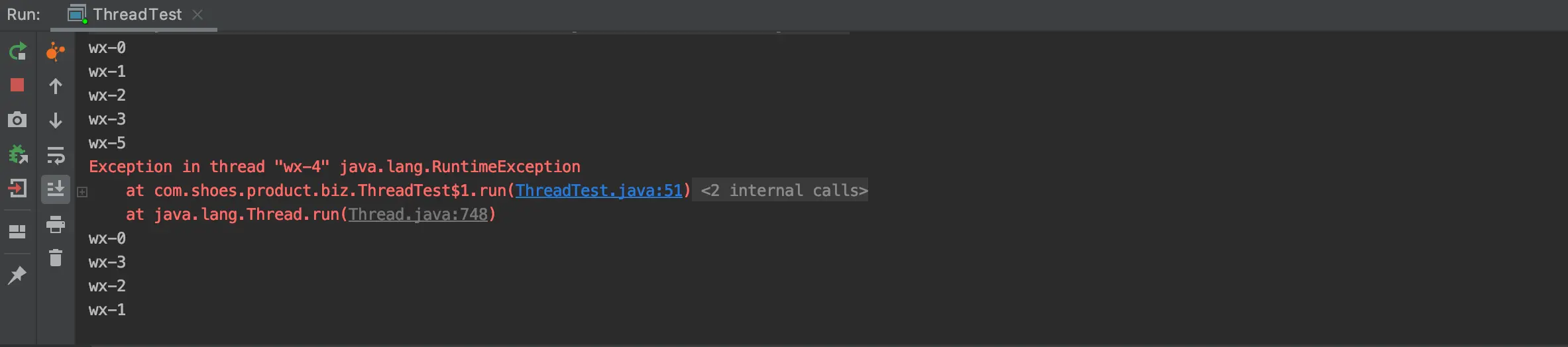 你会发现,它不像上面那个try/catch具体到线程池内那个线程出现了问题,而是说你的主线程执行任务出现了异常。