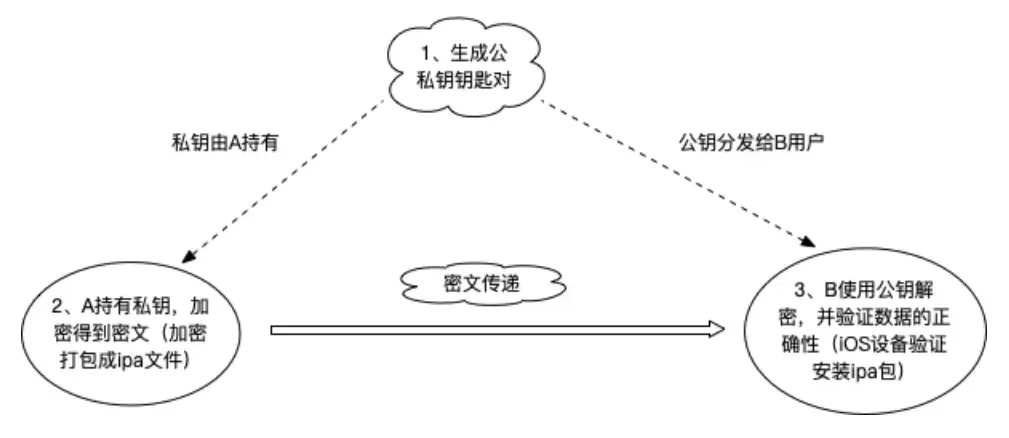 发送数据时,发送方使用私钥对原数据加密成密文传输(加密打包ipa);
