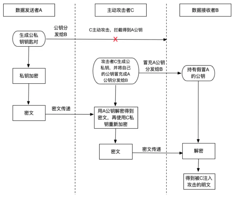 不对称加密中的公钥是公开的,谁都可以得到,这样也就存在了不安全性。比如主动攻击者C冒充数据发送者A,将自己伪装后的公钥分发给数据接收者B,从而达到监听A、B之间通信的目的,又或者是对A、B之间的通信数据进行注入攻击。
