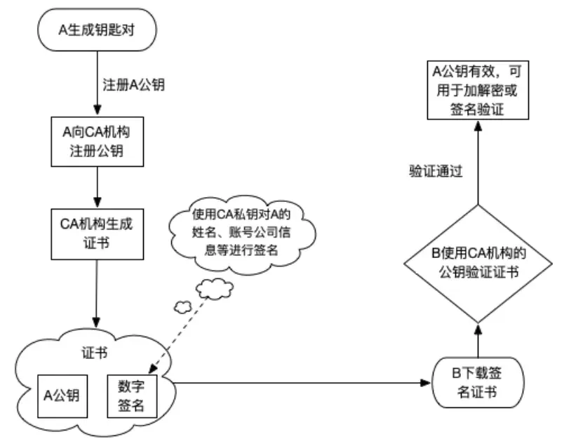 那为了保证获取公钥的安全性,这里引入CA认证(Certificate Authority)。CA是证明公钥合法性的权威机构(Apple就属于CA认证机构),它为每个使用公开密钥的用户发放一个数字证书,数字证书的作用是证明证书中列出的用户合法拥有证书中列出的公开密钥。用户使用CA的公钥对数字证书上的签名进行验证,如果验证通过,也就认为证书内包含的公钥是有效的。