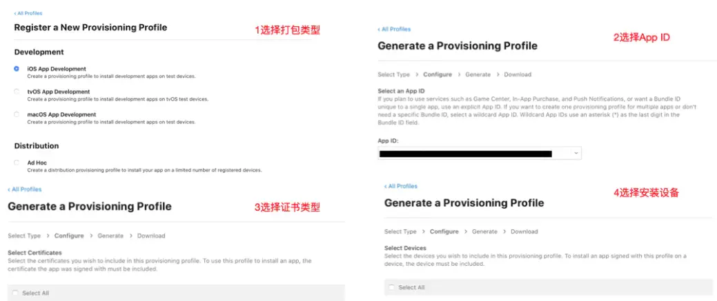 .cer文件只是声明了证书的类型,比如Apple Development、Apple Distribution、APNs推送等等,而至于使用什么证书打包、AppID是什么、打包的App包含了哪些功能、可以在哪些设备上安装,则是通过Provisioning Profile描述文件(.mobileprovision后缀)来说明的,苹果后台将所有这些信息组合后再使用Apple私钥进行签名,最后生成Provisioning Profile描述文件: