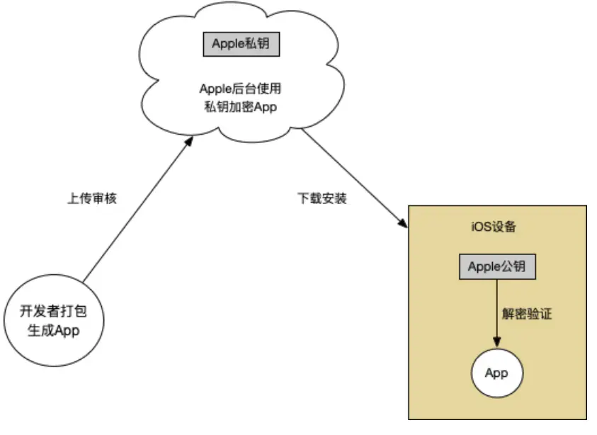 发布App至AppStore之前需要经过苹果后台审核,审核通过苹果后台会用Apple私钥对App数据进行加密签名生成ipa包;用户从AppStore下载App后,使用设备内置的Apple公钥解密验证,验证通过安装成功。由于AppStore分发的过程中上传审核、下载安装的整个过程都处在苹果的生态链内,所以只需要一次验证就能保证安全性。