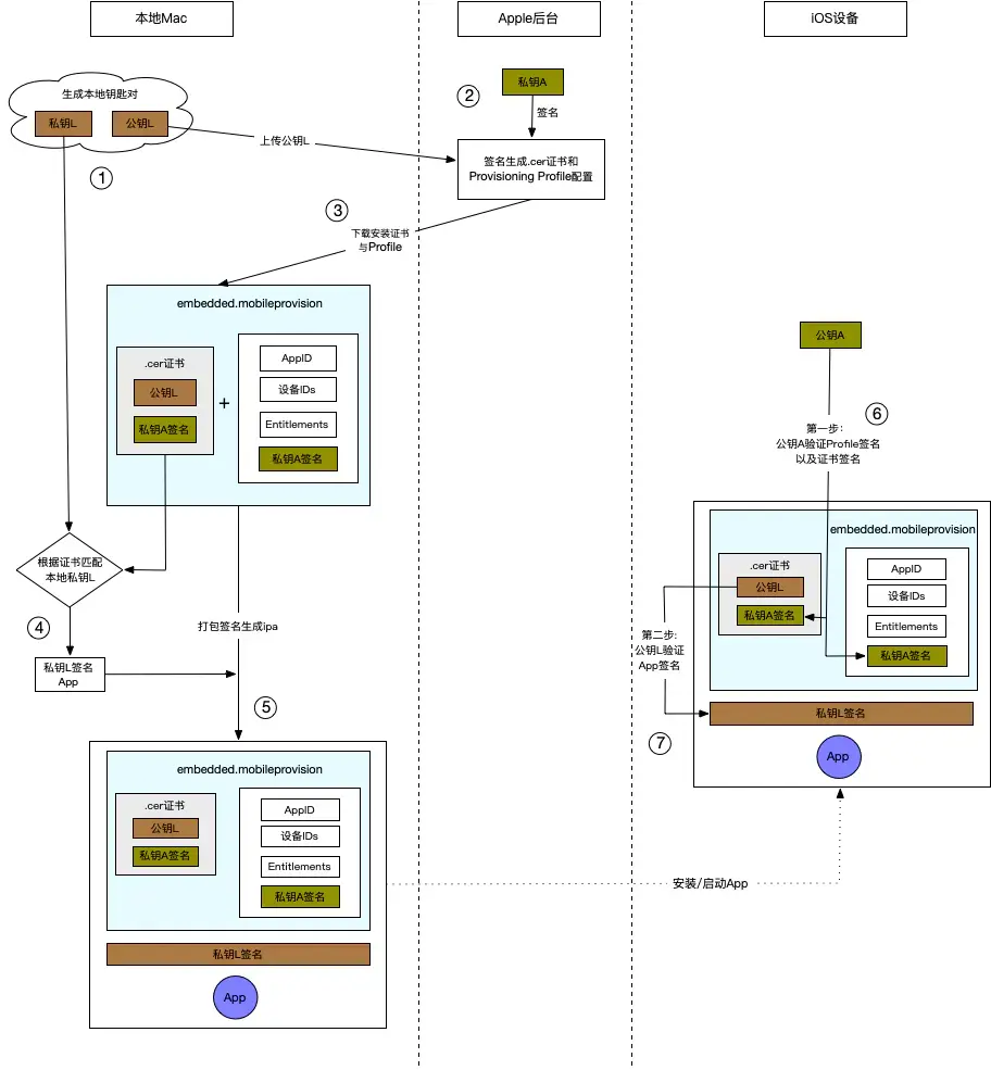 安装/启动,iOS设备使用内置的公钥A验证embedded.mobileprovision是否有效(设备是否在允许安装列表内),同时再次验证里面包含的.cer证书签名是否有效(证书过期与否)并取出公钥L。