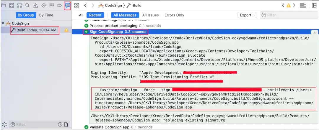 查看Xcode的编译日志,也可以看到签名的详细信息