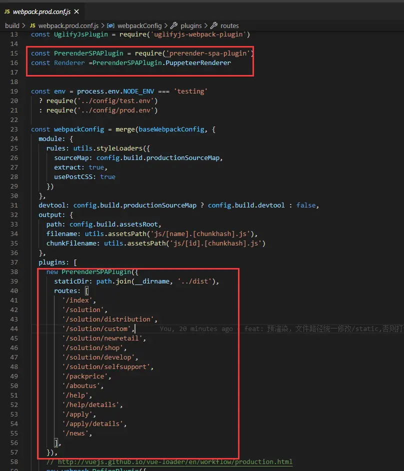 2. 修改webpack.prod.conf.jsconst PrerenderSPAPlugin = require('prerender-spa-plugin') const Renderer =PrerenderSPAPlugin.PuppeteerRenderer plugins:[ new PrerenderSPAPlugin({ //打包之后的文件夹路径 staticDir: path.join(__dirname, '../dist'), //路由 routes: [ '/index', '/solution', '/solution/distribution', '/solution/custom', '/solution/newretail', '/solution/shop', '/solution/develop', '/solution/selfsupport', '/packprice', '/aboutus', '/help', '/help/details', '/apply', '/apply/details', '/news', ], }), ]-