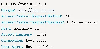 上述代码,http的请求方式为PUT,并且自定义了头信息X-Custom-Header,浏览器发现,这是一个非简单请求,就自动触发一个预检请求,要求服务器确认可以这样请求。下面是预检请求的头信息: