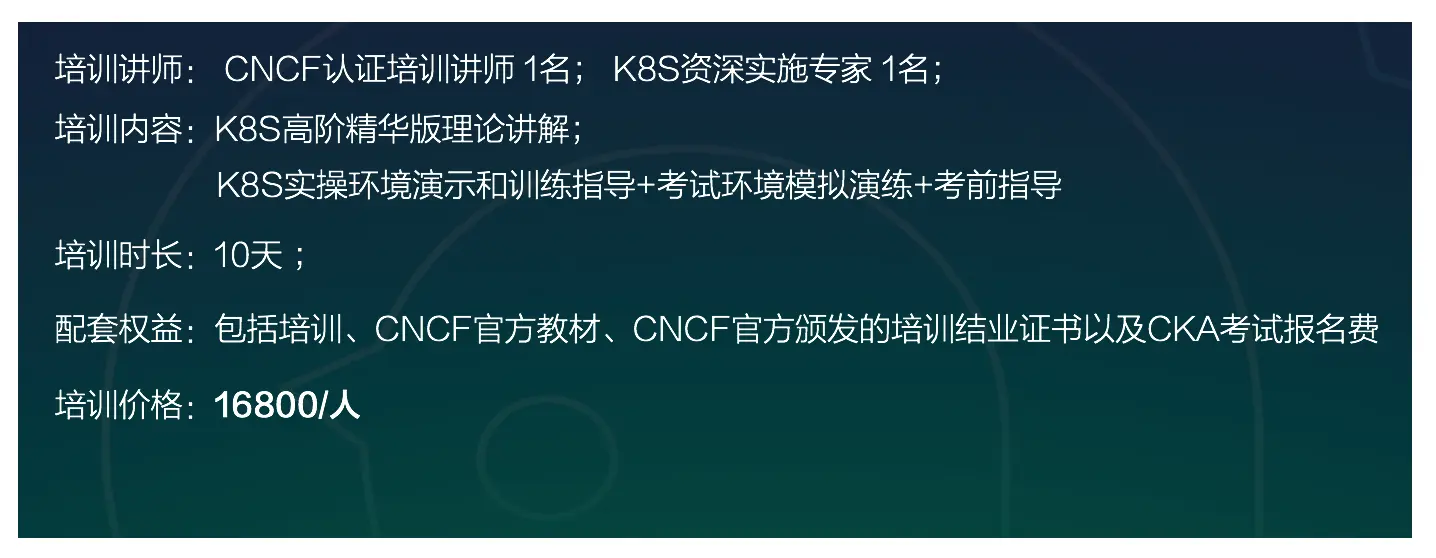 为学员提供从基础、原理到实践的系统性K8S培训,并结合微服务、DevOps等理论进行场景化的IT架构设计指导; 此外学员还将获得:由CNCF官方颁发的CKA培训结业证书(区别于CKA证书);由CNCF总部直邮的官方课程资料;CKA考试报名的独家折扣; 帮助所在企业迅速提升K8S团队技术能力,以及申请认证 Kubernetes 服务提供商(KCSP)的机会。