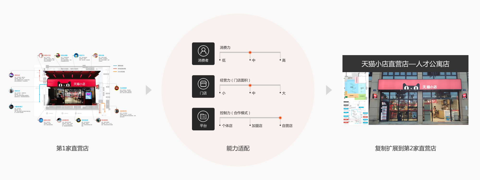 设计内容:因此在直营店的设计过程中,为了保证天猫小店的体验统一性,将第一家直营店的改造方案从门店自身经营力、周边消费者消费力和平台控制力三个维度对第二家直营店-天猫小店人才公寓店进行了分析匹配,最终通过对方案的复制与扩展,即保证了天猫小店品牌透传的一致性,又满足了不同小店的经营差异性。(如图13)