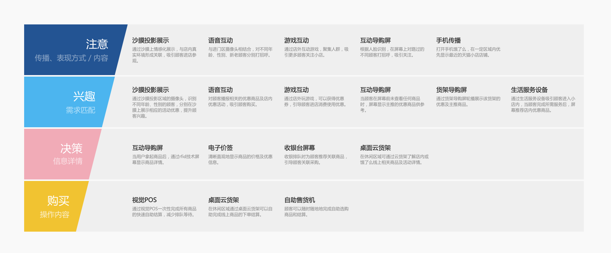 当完成店内触点体验方式的设计后,需要对每个触点的内容加以完善,因此运用到了线上常用的转化漏斗模型。通过将触点代入到转化流程中分析,可以帮助发散每个触点的展示内容,不再仅仅停留于满足一个功能需求,而是让其尽可能地在“注意-兴趣-决策-购买”整个线下门店转化流程的各个环节中发挥最大的价值。(如图10)