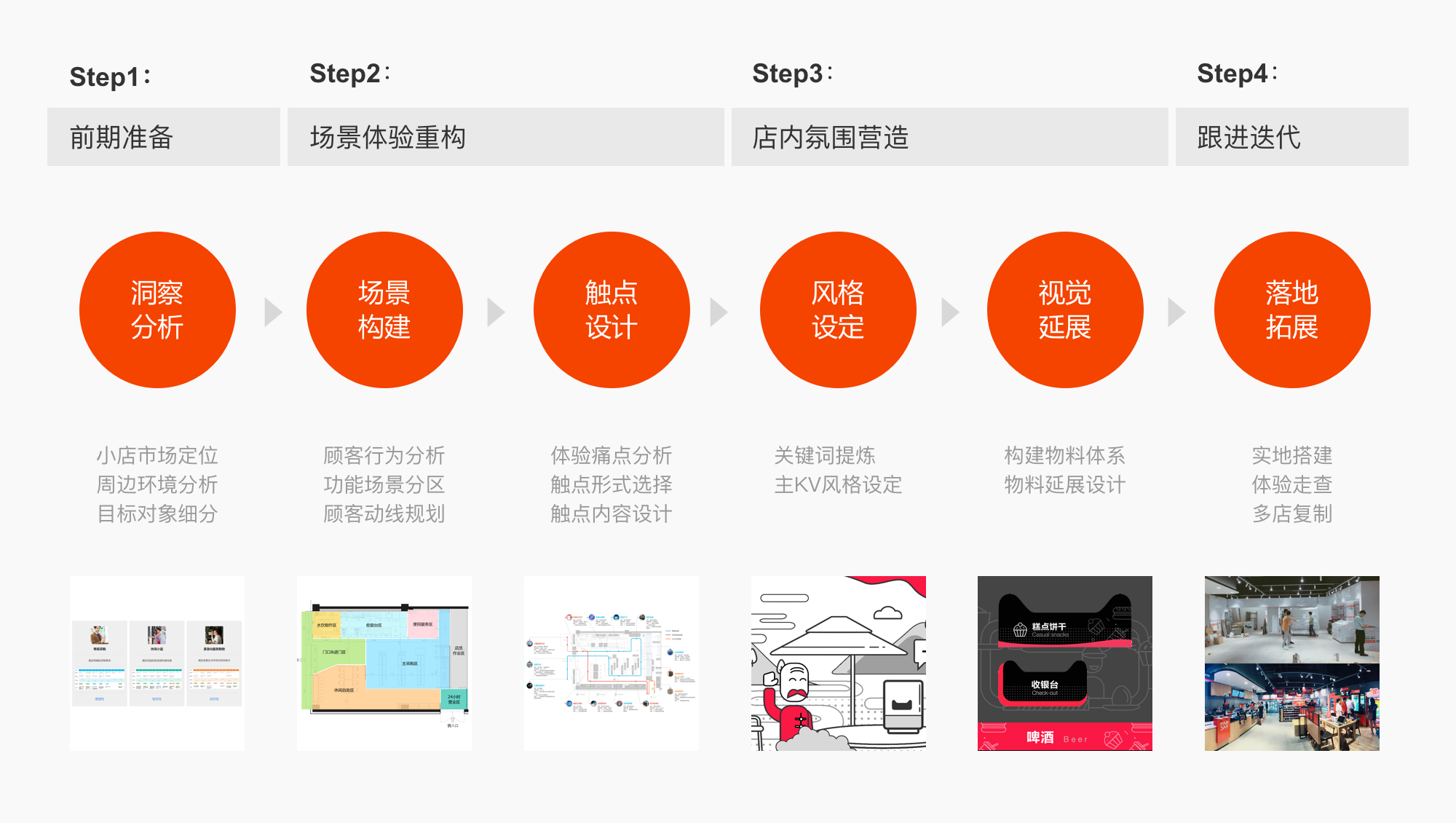 设计策略:针对小店市场的差异性,在门店体验方案的设计上都需要具体匹配小店能力进行方案的复制与扩展。