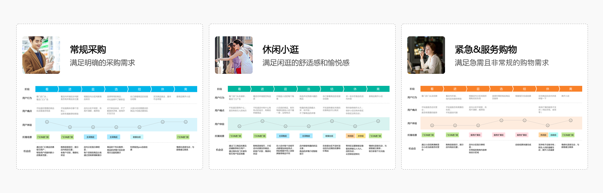设计内容:结合该设计策略,在天猫小店直营店完成店内功能分区后,通过梳理三类典型用户在传统小店中的体验地图,深入分析不同用户在进入小店全流程中所关注的核心触点及问题,以便在直营店中能为不同顾客的关注点设计相应的解决方案。(如图8)