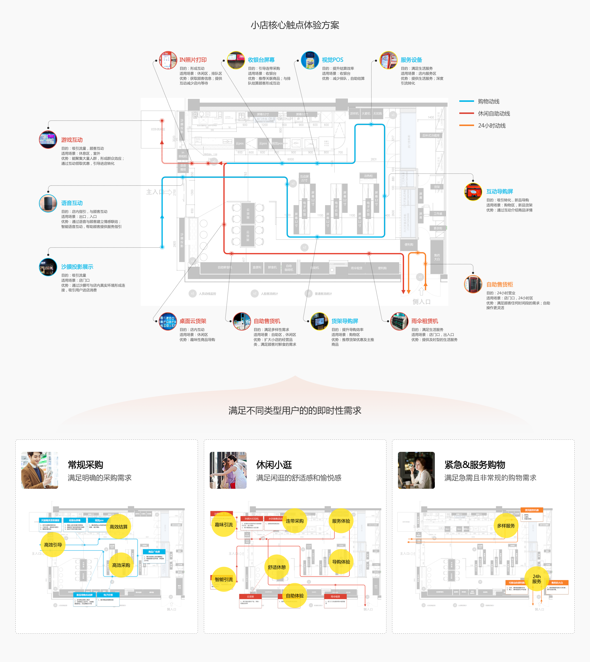 对于常规采购型用户,他们的主要需求就是快速进店买完所需用品,因此通过进门处的语音指引、货架区的互动显示屏和收银台的自助视觉收银机,为其带来高效指引-高效导购-高效结算的全流程快捷体验。