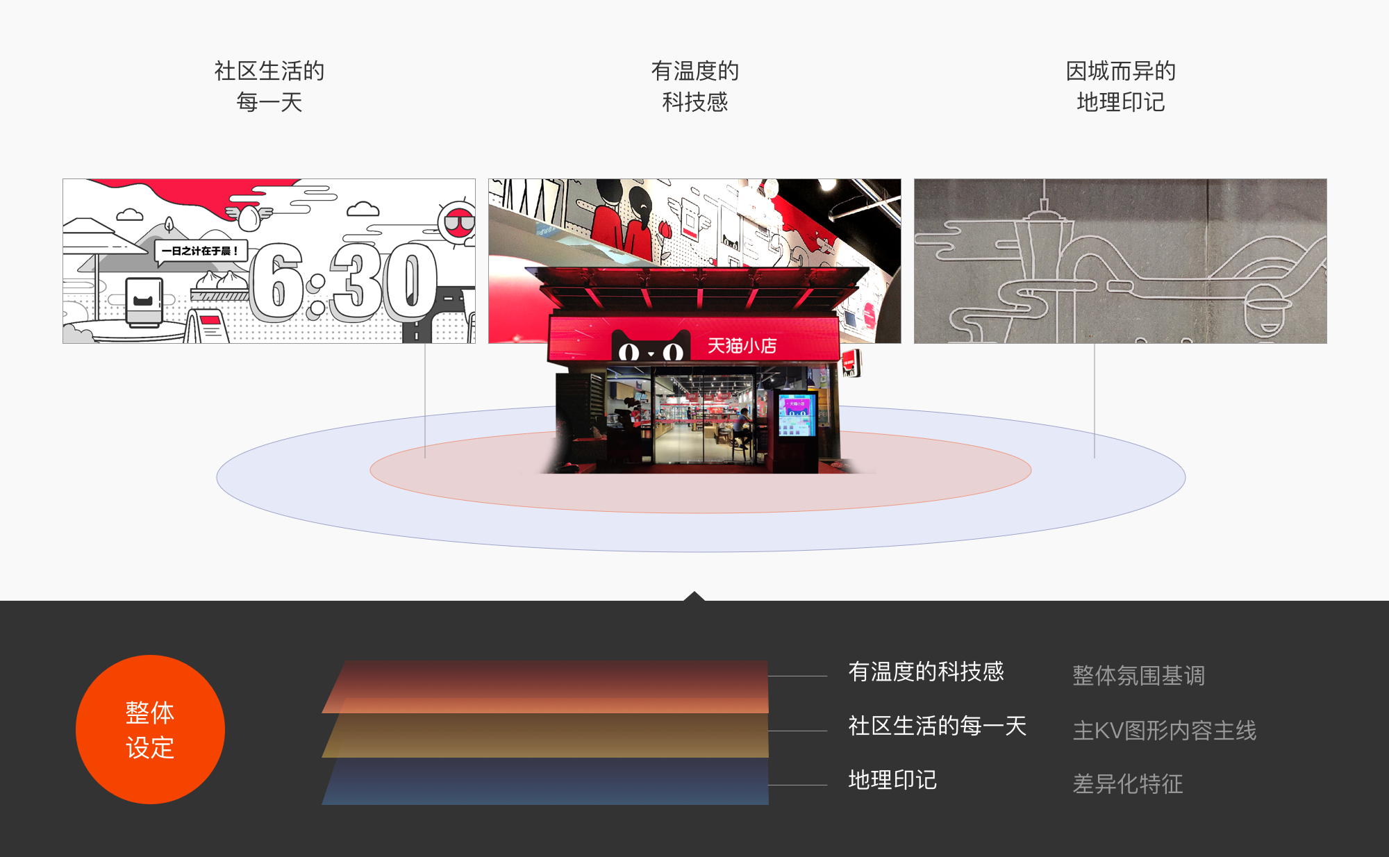 首先在确定店内主风格基调之前,我们明确了天猫小店品牌传递的关键词:情感上,天猫小店希望给用户一种“有温度的科技感”;同时作为社群伙伴,天猫小店希望陪伴人们“社区生活的每一天”;最后我们还希望增加一些“地理印记”,使不同城市不同地区的天猫小店视觉元素都会不一而同。(如图11)