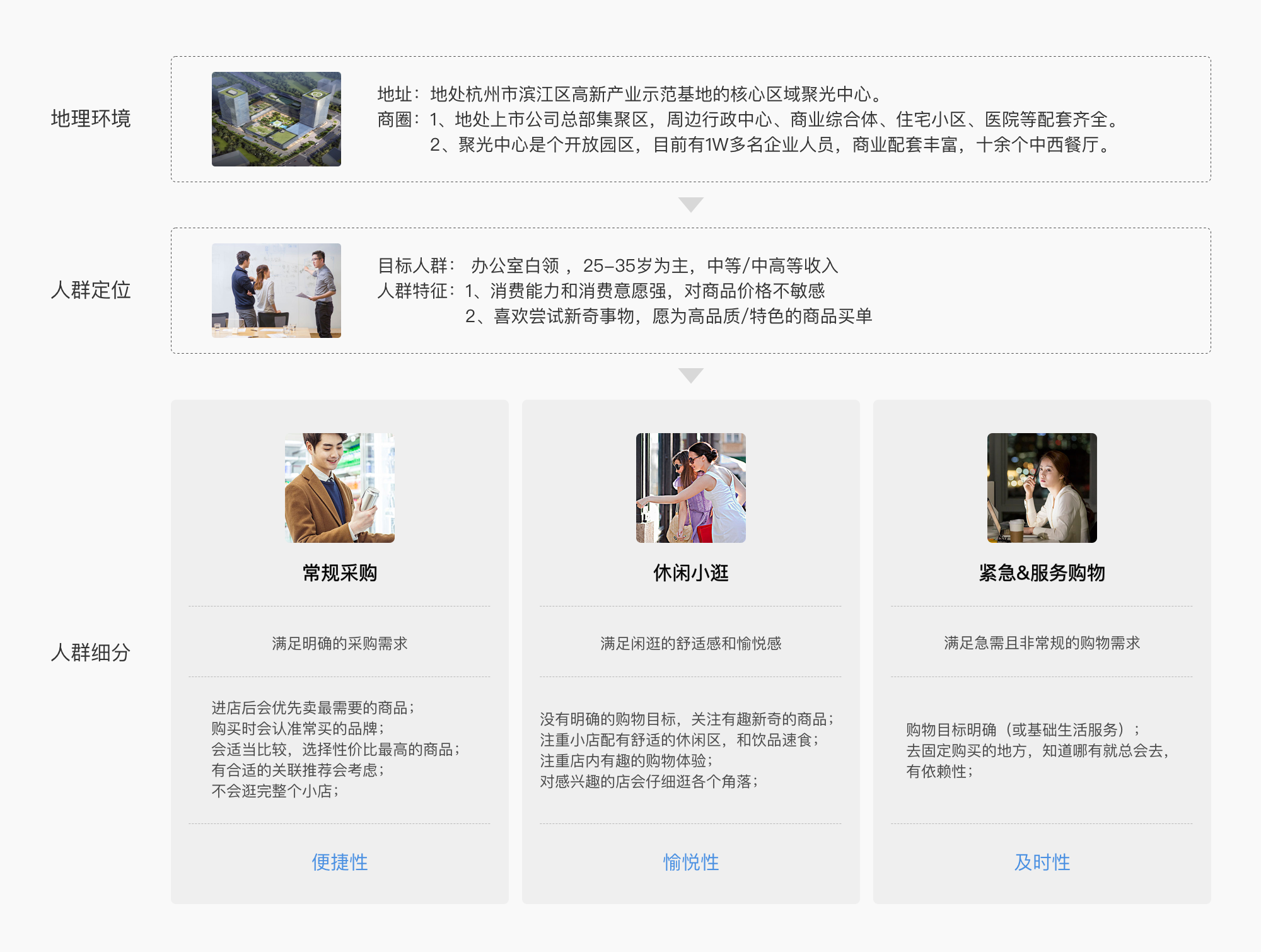 设计内容:因此结合这样的设计策略,在天猫小店直营店的设计中,通过对小店周边环境进行分析,明确了小店的消费群体主要集中在滨江聚光中心周围工作的办公白领。同时通过进一步洞察周边人群进出小店的行为动机,可以将其细分为常规采购型、休闲小逛型和紧急&服务购物型三类典型用户。(如图5)
