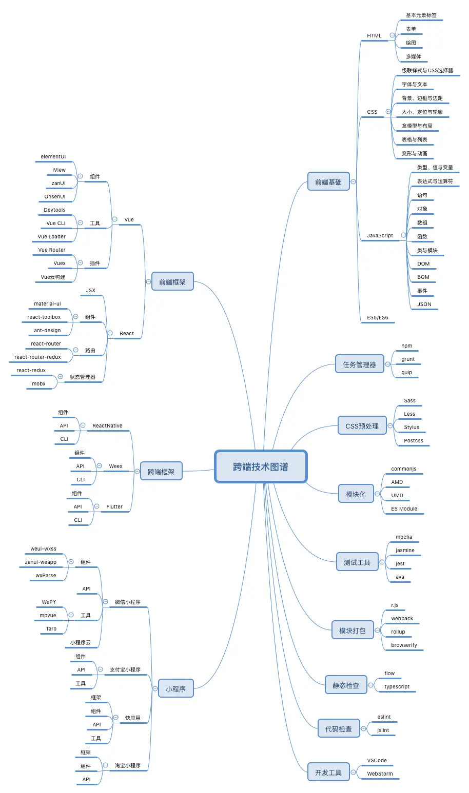 这里为大家整理了一份跨端技术图谱,这份图谱并没有去穷尽所有的前端技术,只是从客户端开发的视角去梳理常用的技术点,帮助大家理清脉络。