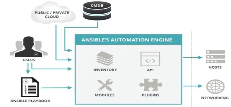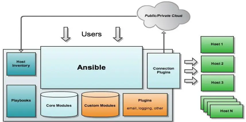 - ANSIBLE:组合INVENTORY、 API、 MODULES、 PLUGINS的绿框,可以理解为是ansible命令工具,其为核心执行工具