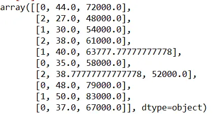 X[:,1:3] = imputer.transform(X[:,1:3])