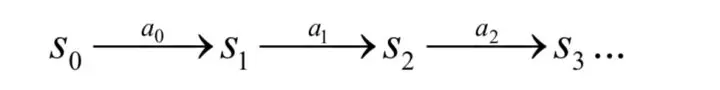 立即回报与当前状态、当前采取的动作以及下一时刻的状态有关。在每个时刻t,智能体选择一个动作at执行,之后进入下一状态st+1,环境给出回报值。智能体从某一初始状态开始,每个时刻选择一个动作执行,然后进入下一个状态,得到一个回报,如此反复: