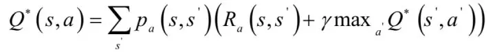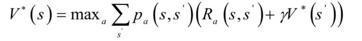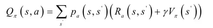 动作价值函数除了指定初始状态s与策略π之外,还指定了在当前的状态s时执行的动作a。这个函数衡量的是按照某一策略,在某一状态时执行各种动作的价值。这个值等于在当前状态s下执行一个动作后的立即回报Ra(s,s'),以及在下一个状态s'时按照策略π执行所得到的状态价值函数Vπ(s')之和,此时也要对状态转移pa(s,s')概率求数学期望。状态价值函数和动作值函数的计算公式称为贝尔曼方程,它们是马尔可夫决策过程的核心。