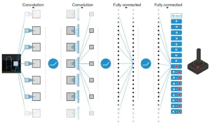 一旦训练出了神经网络,便可以得到任何画面下要执行的动作,这通过使用Q函数值和贪心策略来实现,从而完成游戏的控制。