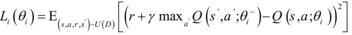 文献[13]提出了Double DQN(DDQN)算法。DDQN中有两组不同的参数,和θ和θ-。θ用于选择对应最大Q值的动作,θ-用于评估最优动作的Q值。这两组参数将动作选择和策略评估分离,降低了过高估计Q值的风险。DDQN 使用当前值网络的参数θ选择最优动作,用目标值网络的参数θ-评估该最优动作。实验结果证明,DDQN能更准确的估计Q函数值,使得训练算法和训练得到的策略更为稳定。