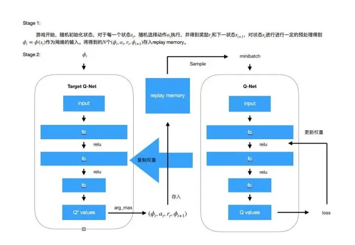 其中γ为折扣因子,θi为Q网络在第次迭代时的参数值,为第第次迭代时用于计算目标值的Q网络的参数值,这个神经网络称为目标网络。目标网络与当前的Q网络分离开来,这是与2013年DQN最大的区别,当前Q网络的值在训练时每次都迭代更新,而目标网络则周期性的从当前Q网络同步过来,每多次迭代执行一次拷贝。系统结构如下图所示: