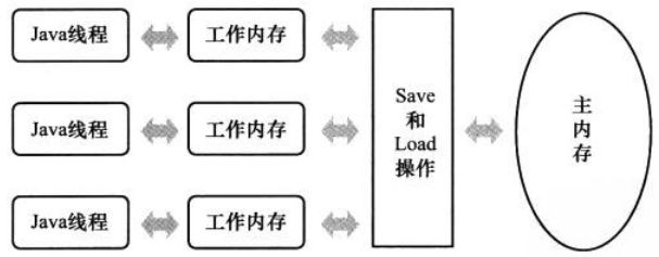 Java内存模型规定所有的变量都是存在主内存中,每个线程都有自己的工作内存。每个线程对共享数据的读、写操作都只在各自的工作内存中,不能直接在主内存中进行;在各自工作内存中对数据操作完成后,同步到主内存中;线程间不能访问各自工作内存中的数据,只能通过主内存来完成。下面用一张图来展示线程、主内存和工作内存三者之间的交互关系。