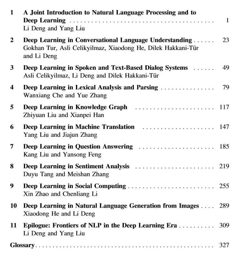 本书第一章首先回顾了 NLP 的基础知识以及本书后续章节所涵盖的 NLP 的主要范围,然后深入探讨了 NLP 的历史发展,总结为三大浪潮和未来方向。第 2-10 章对应用于 NLP 的深度学习最新进展进行了深入研究,分为九个单独的章节,每个章节涵盖 NLP 的一个(很大程度上是独立的)应用领域。每章的主体由在各自领域积极工作的主要研究人员和专家撰写。