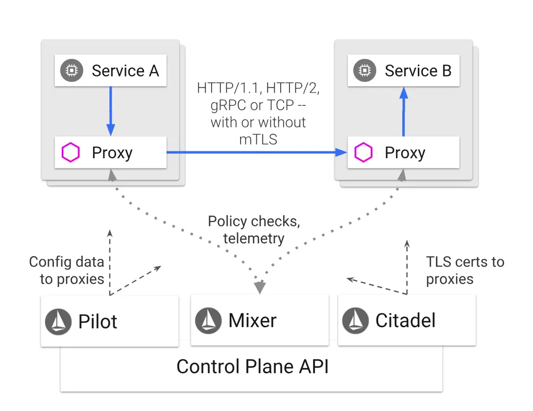 数据平面由一组以 sidecar 方式部署的智能代理(Envoy)组成。这些代理可以调节和控制微服务及 Mixer 之间所有的网络通信。 控制平面负责管理和配置代理来路由流量。此外控制平面配置 Mixer 以实施策略和收集遥测数据。