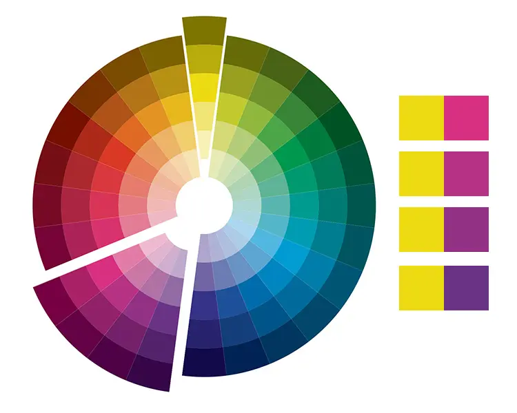 在色轮上夹角为120度-180度之间的两个颜色被称为对比色,比较典型的对比色有红黄蓝。关于对比色以往的主流用法是,一个颜色的明度和饱和度较高,而另一个颜色的明度和饱和度则相对较低。然而,近几年这种高饱和度、同等明度的对比色搭配也变得非常流行,这种色彩组合的特点是年轻时尚,且具有很强的视觉冲击力,广受以年轻人为主要消费群的品牌所青睐。
