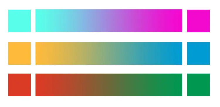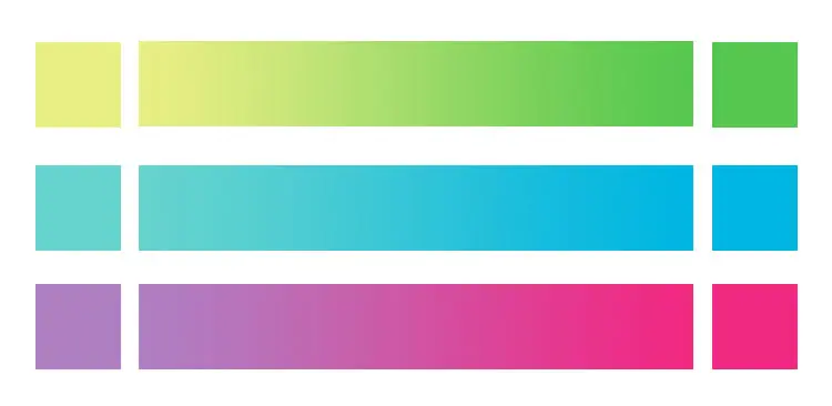 注意事项:在软件中创建此类渐变色时,只吸取首尾端的两个颜色来拉渐变,出来的效果会比较温和,中间的色调会偏灰;如果想要更鲜艳的效果,可以在色条中间增加一两个过渡色,例如在青色到玫红色的渐变中可以增加蓝色和紫色,前后两个效果有很大差别,你可以根据自己的需求进行选择。