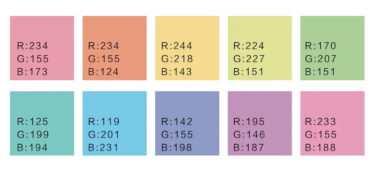 柔色从直观感受来说就是那些看起来比较柔和、清新、舒适的颜色,这类颜色的明度和饱和度比较高,如粉色、浅紫色、浅绿色、浅蓝色等等。适用于食品、护肤品类的设计。