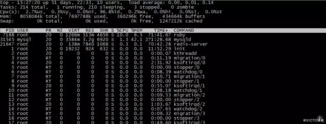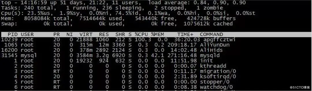 下图是登录系统后,执行top命令的输出结果,综合查看,系统整体负载并不高,但是带宽占用很高,由于云服务器带宽基本耗尽,SSH登录服务器也非常慢,几乎不能执行任何操作。